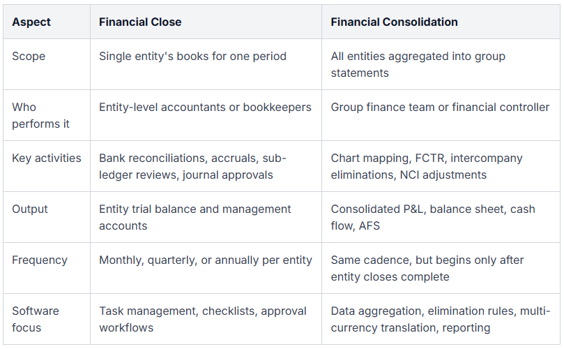 Financial close finalizes an individual entity's books for a reporting period; financial consolidation aggregates those closed books into group-level statements with eliminations and adjustments applied.