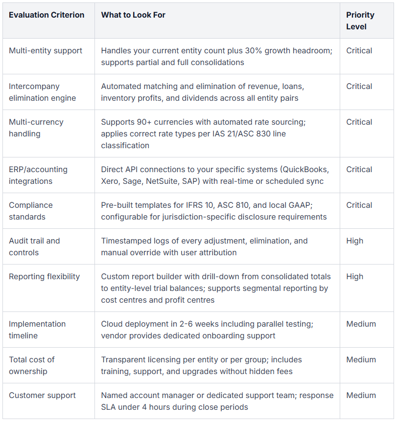 The eight capabilities covered throughout this article form a decision framework, not a shopping list. Start by mapping your group's specific pain points. If currency translation errors consume two days every close, that feature jumps to the top. If your auditors consistently question elimination entries, the intercompany engine matters most. Compliance support for IFRS 10, ASC 810, or local GAAP requirements isn't optional for any group, but the depth of compliance automation you need depends on how many jurisdictions your entities report under.