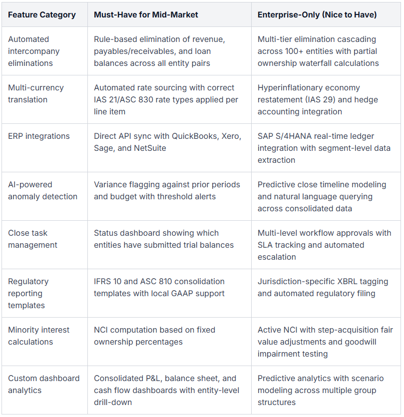 Not every feature on a vendor's marketing page is relevant to a group running 10 to 50 entities. Enterprise platforms built for Fortune 500 groups pack capabilities that mid-market teams will never configure, and paying for unused complexity is a poor use of budget. The table below separates must-have features from enterprise-tier extras so you can focus your evaluation on what actually affects your consolidation cycle.