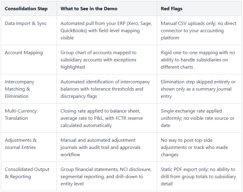 Most demo evaluation mistakes come from focusing on the reporting output (the dashboards look great) while ignoring the engine underneath. A polished consolidated balance sheet means nothing if the intercompany elimination logic can't handle your actual transaction flows. Work through the demo systematically, category by category.