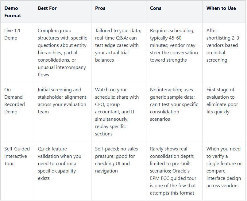 Three demo formats exist for consolidation software: live one-to-one, on-demand recorded, and self-guided interactive tours, each suited to a different stage of your evaluation process.
