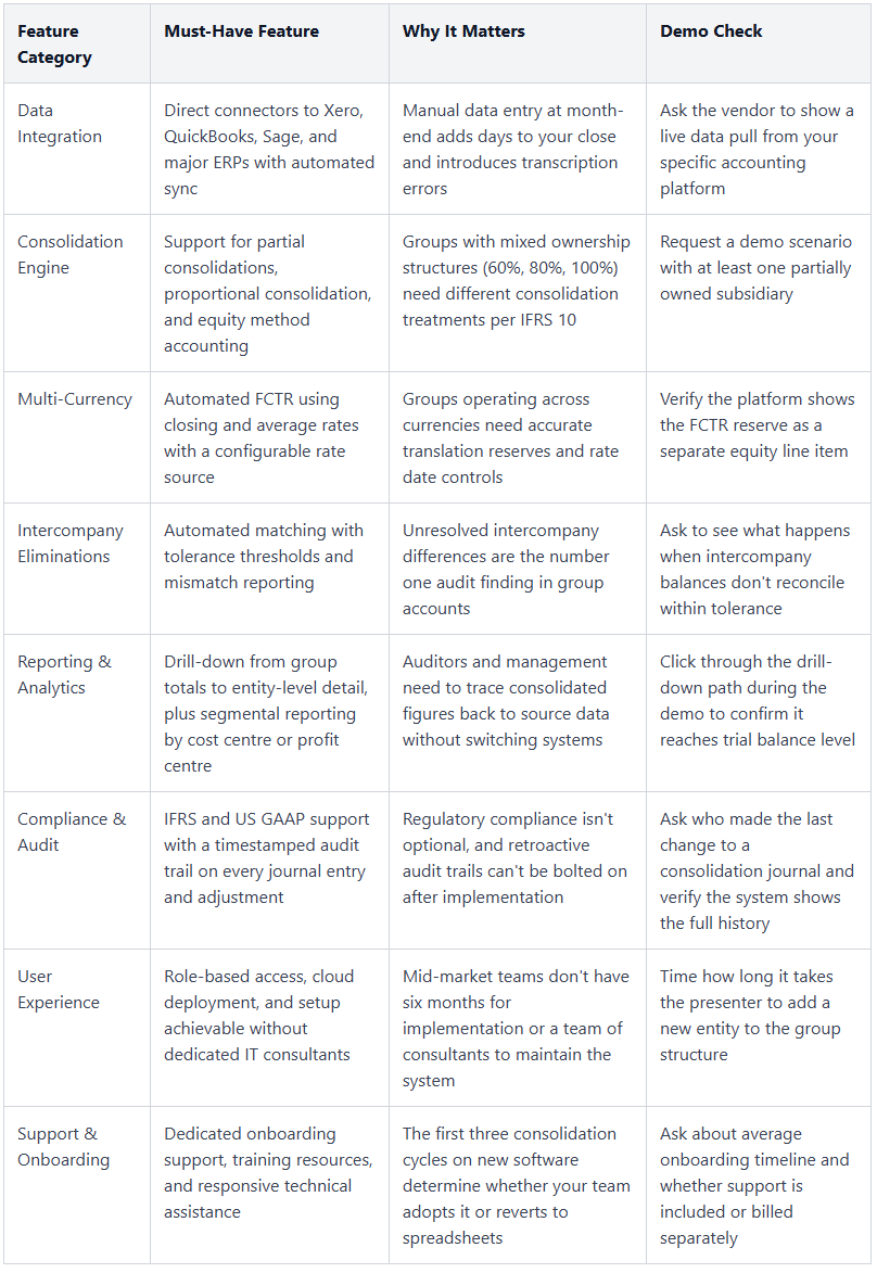 Evaluate consolidation software demos across eight feature categories: data integration, consolidation engine, multi-currency, eliminations, reporting, compliance, user experience, and support quality.
