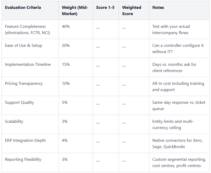 The temptation after watching three demos in a week is to go with your gut. Resist that. Gut feel is how teams end up choosing the vendor with the best presenter rather than the best consolidation engine. A structured scorecard forces you to compare what actually matters: can the tool handle your FCTR rules, your NCI calculations, your partial consolidations?